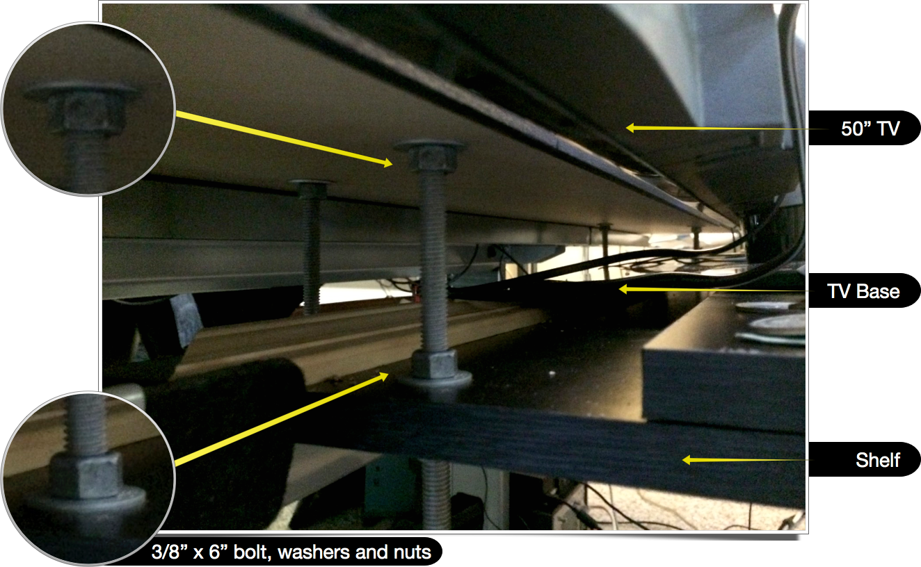 The simplest solution was to mount a new shelf under the back of the table. I bought a black 3' x 1' MDF shelf form Home Depot, and a second black 3' x 8" black shelf. This wound up being necessary as the first shelf wasn't deep enough, and I needed to raise and tilt the monitor slightly after it was positioned.