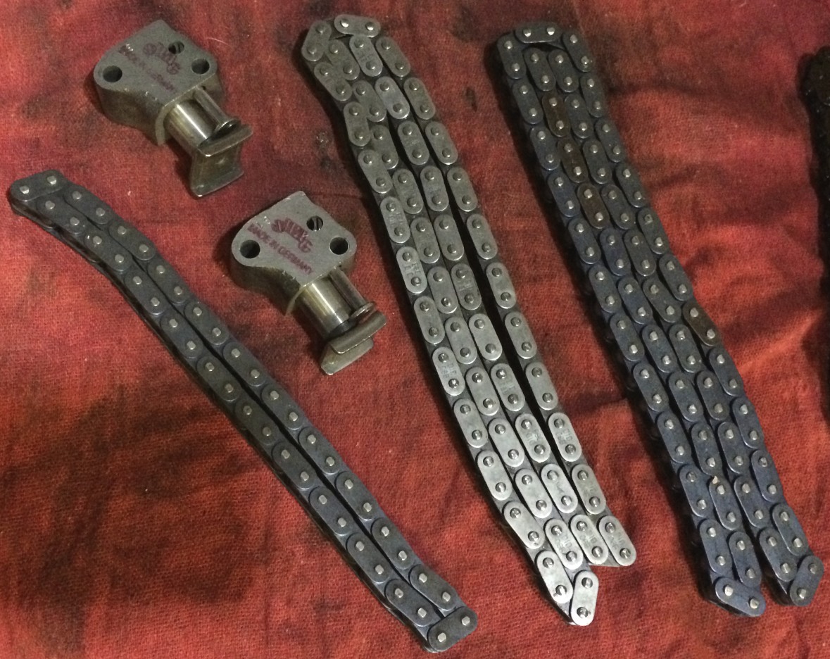 As long as I was retiming, I figured I might as well replace the chains and tensioners while I was at it. I bought new chains, tensioners and a water pump from Rock Auto, and got to work.