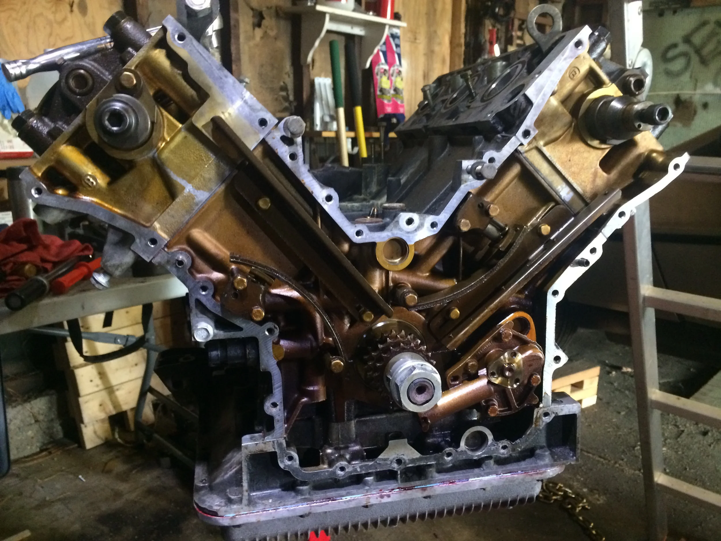 IMPORTANT NOTE: It turns out the 2.8L pump is NOT compatible with the 3.0L engine -- the gears are too short. I discovered this the hard way -- after the engine was re-isntalled in the car and cranked over. I heard a loud screeching sound, pulled the engine, removed the lower crankcase and found that the oil never made it out of the pan. I had to replace the main bearings, the connecting rod bearings, and get a new gear from dn010 on DMCTalk to convert the pump for the 3.0L engine (lucky he had one -- I had no luck finding one to buy anywhere else).
