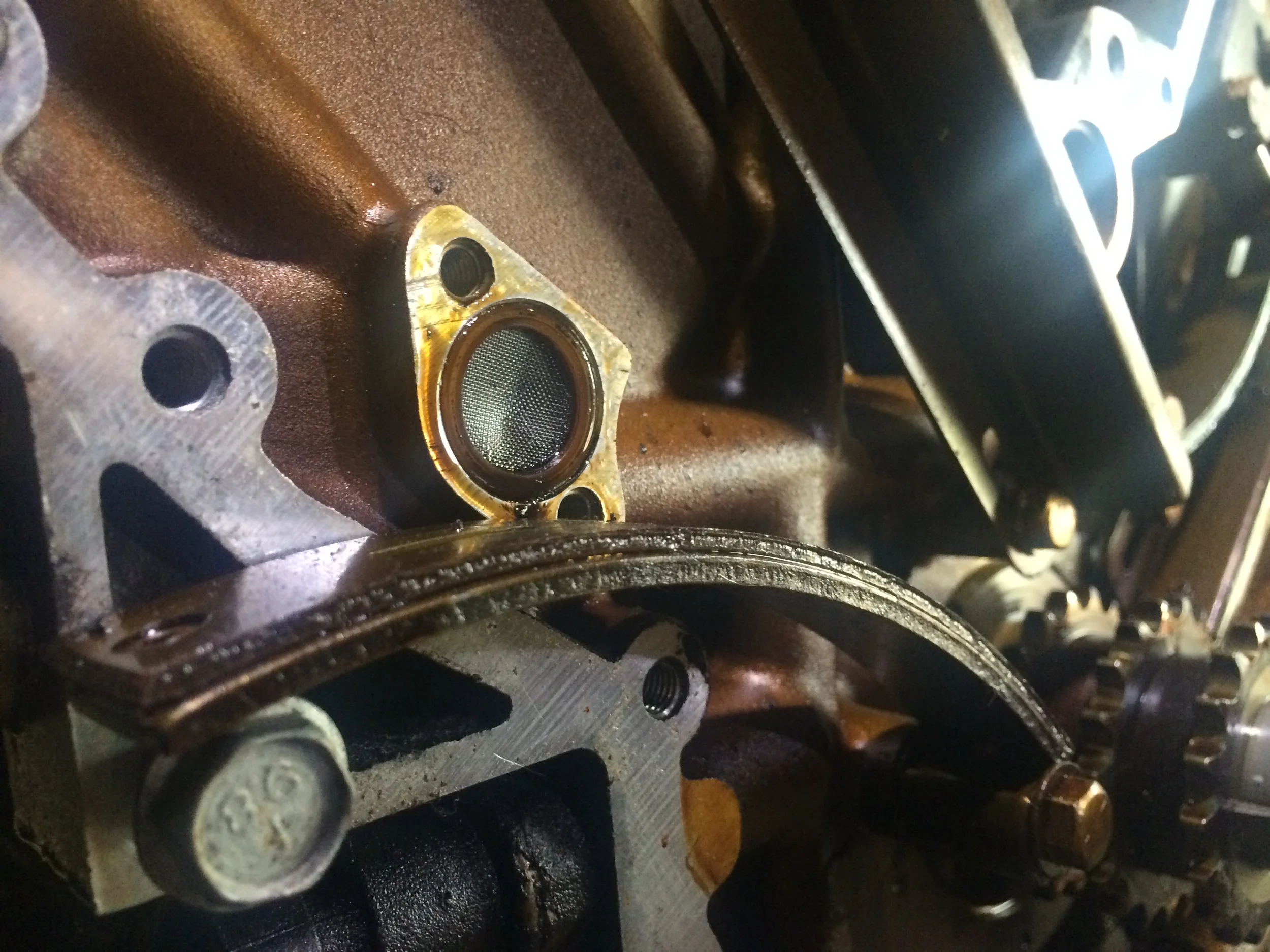 A broken bolt on the oil pump from over-tighteneing, after attempting to drill it out.