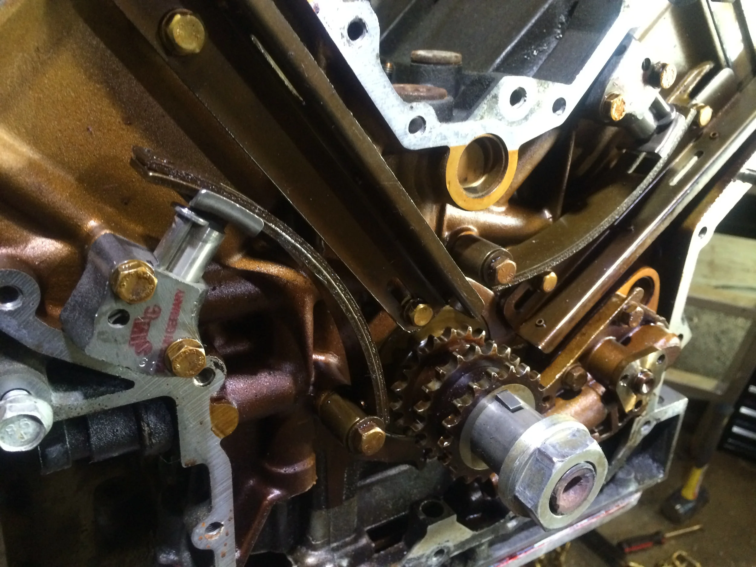 For the other chain, the crank is rotated so that the timing mark points at the bottommost bolt on the oil pump. As with the passenger side, the single marked link not the chain fits on the stamped mark on the crank sprocket, while the unmarked link between the two marked links aligns with the stamped mark on the cam sprocket.