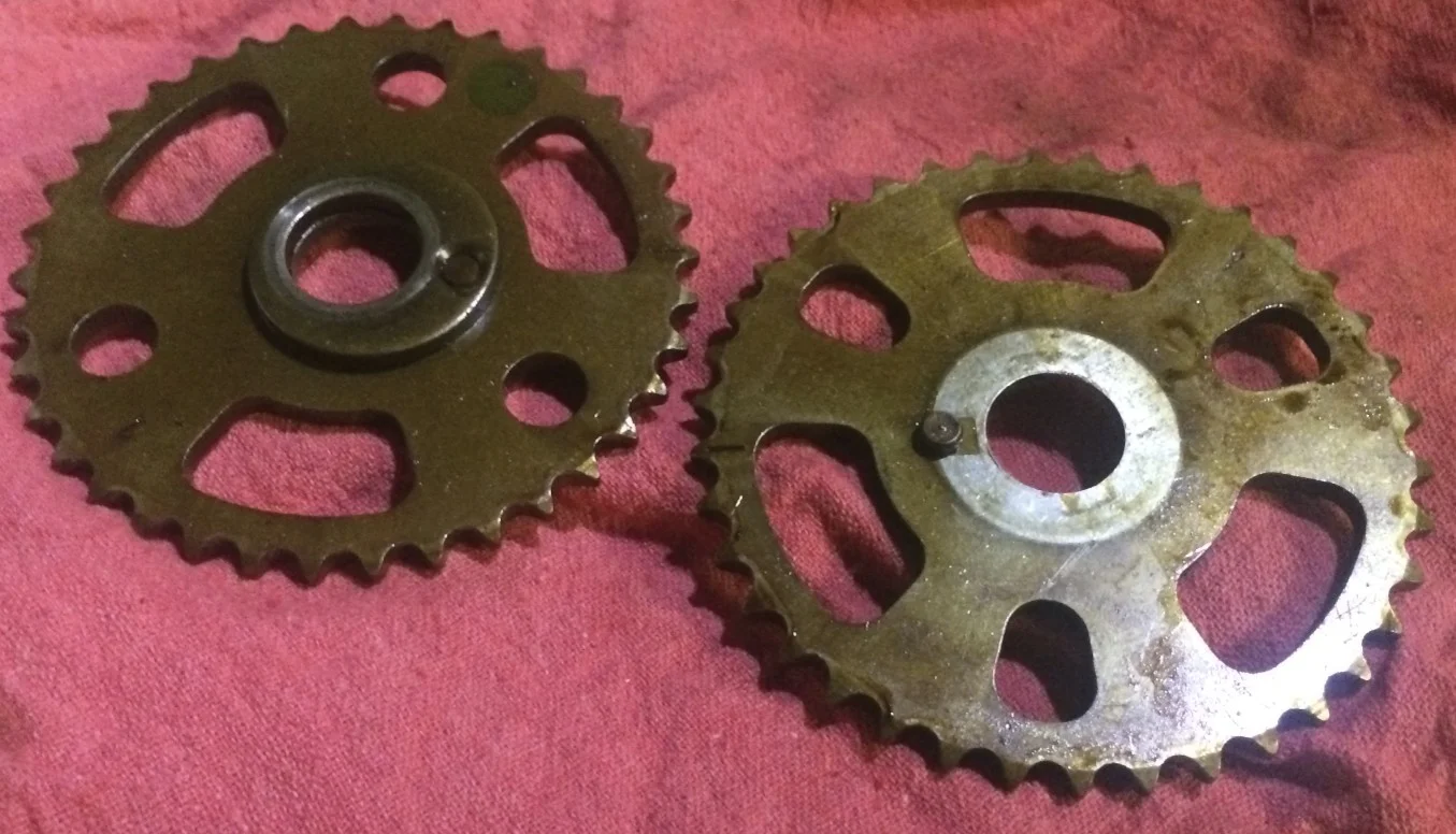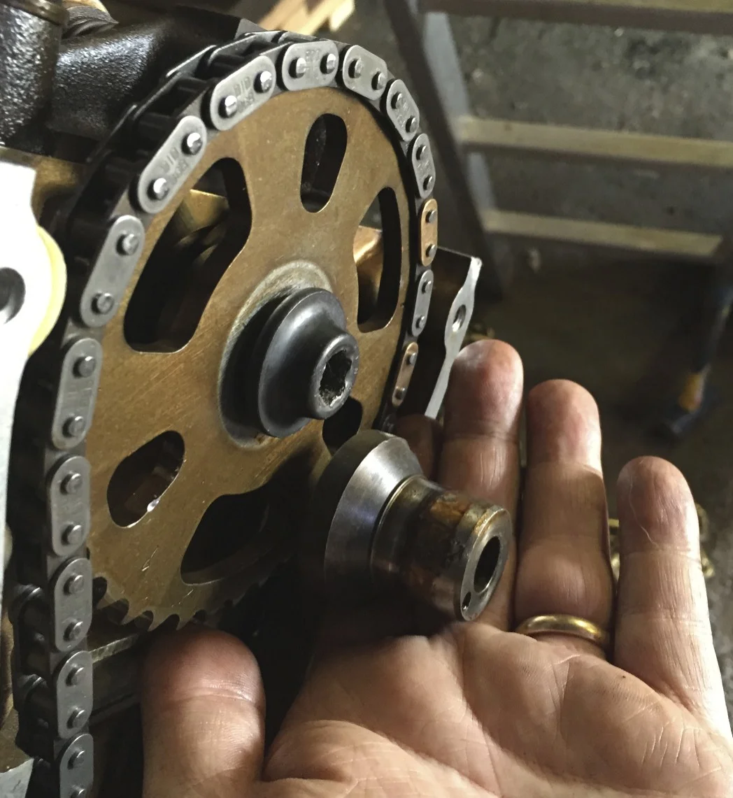 There are three sprockets on the crank. The passenger side timing chain goes on first, followed by the driver's side chain and finally the oil pump chain. Since the driver's side sprocket is further out from the engine, it has a built-in spacer to ensure that the chain is aligned properly.