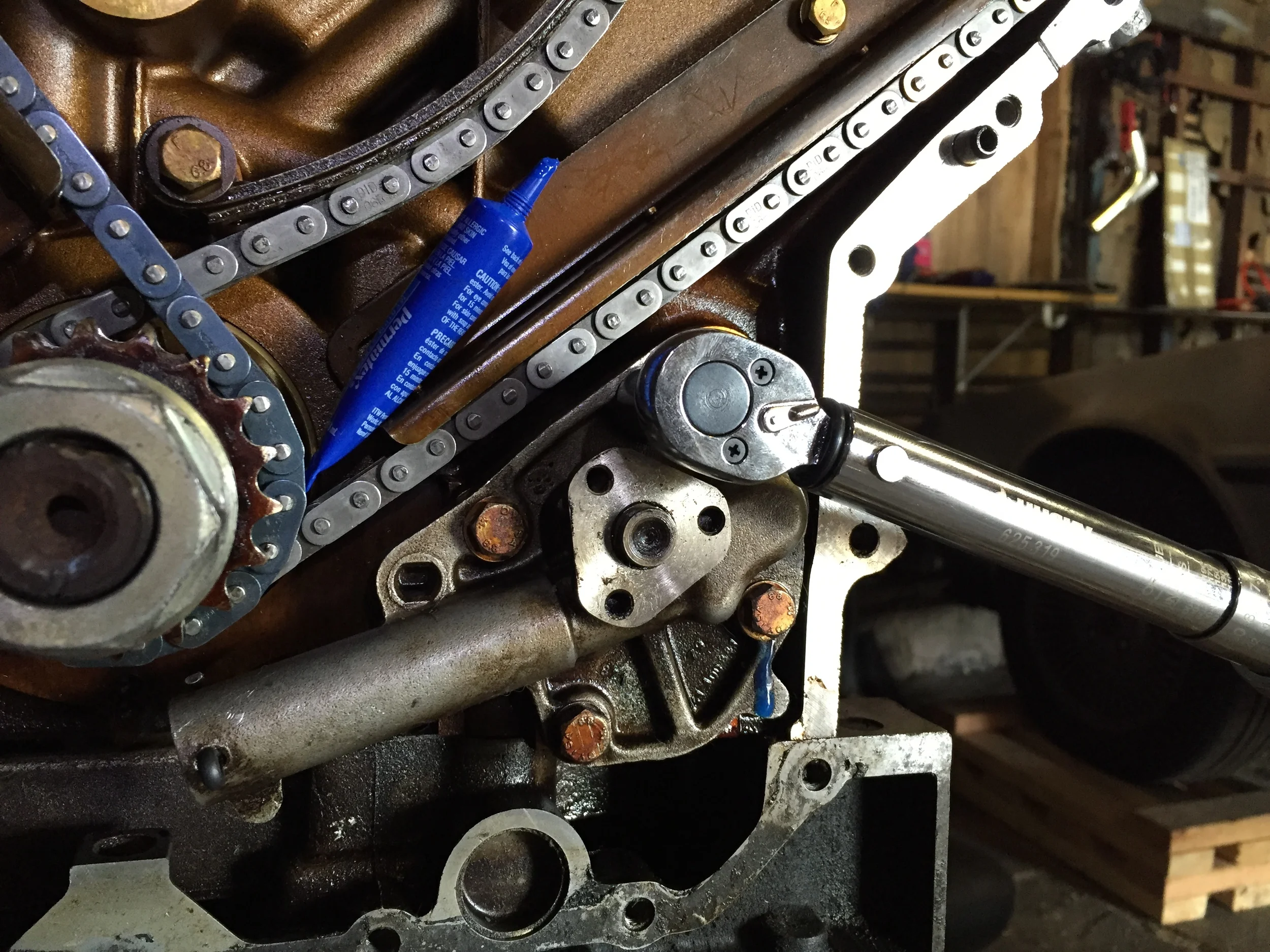 Torquing down the oil pump. The tube of blue LockTite can be seen resting on the chain guide,