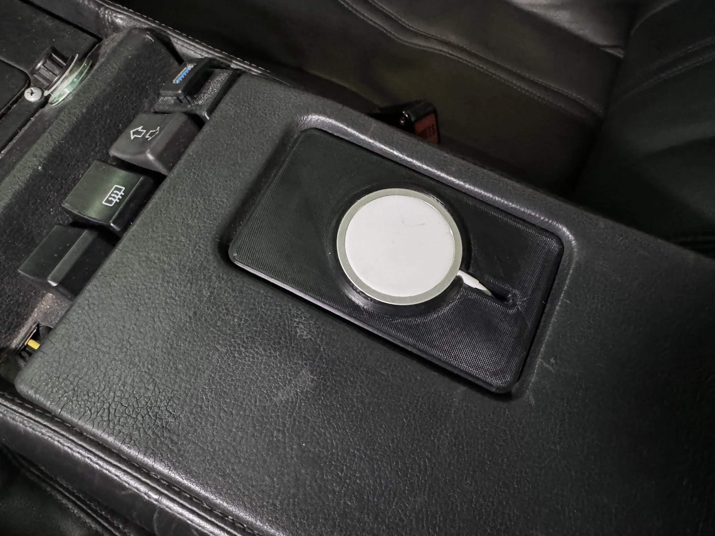 I needed to keep my phone charged. While I do have a USB port I could plug the phone into, I’m lazy and don’t want to deal with that. Instead, I 3D printed a carrier for an Apple MagSafe charging puck that replaces the ashtray, powered by a USB-C charger behind the driver’s seat and wired into an accessory-switched fuse. The magnets keep the phone from sliding around during normal driving, although slamming on the brakes will cause it to break free.